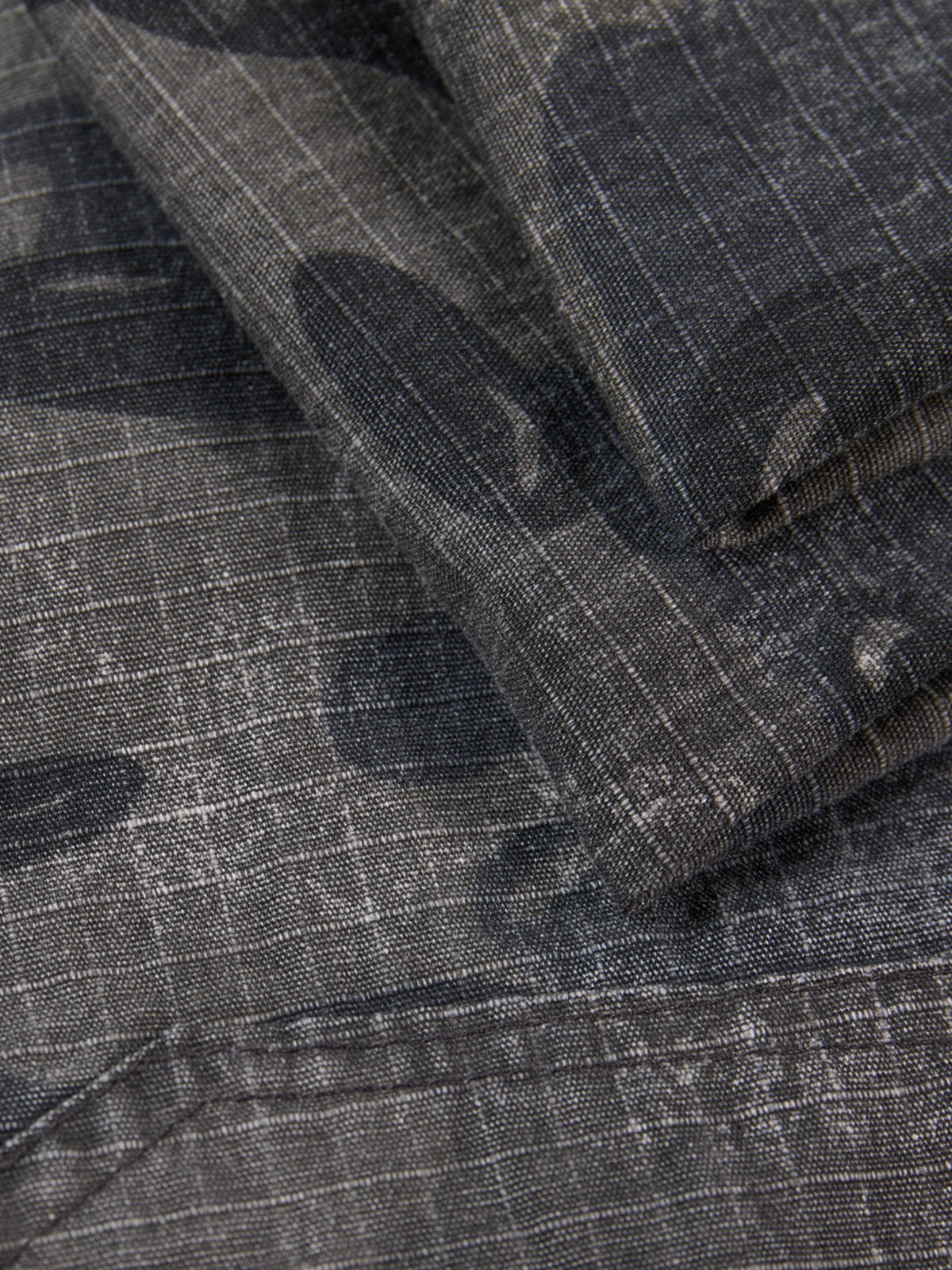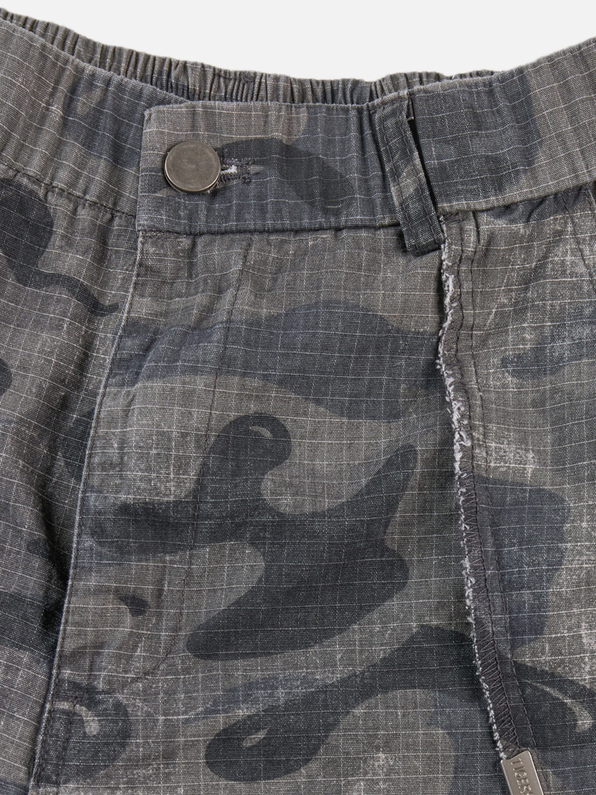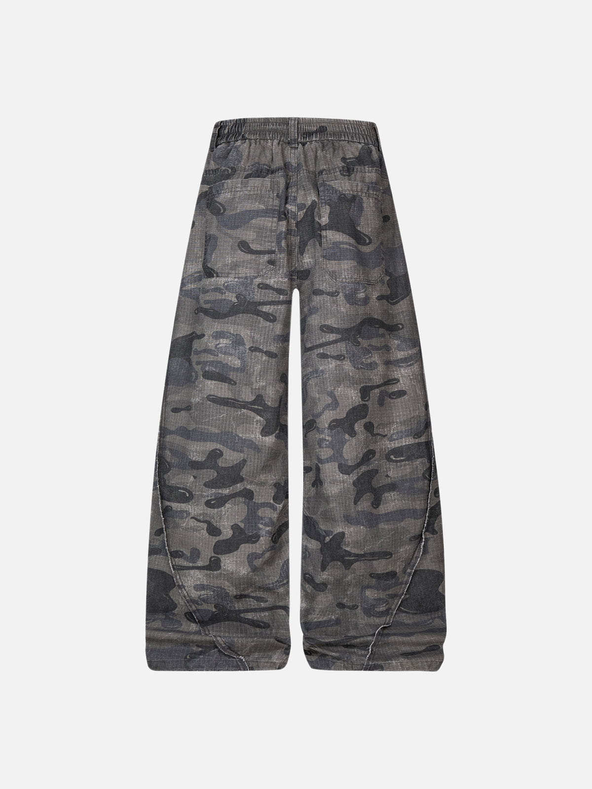Structured barrel-leg construction with an exaggerated curve through the leg for a sculpted silhouette. All-over camo pattern enhances the volume, while panel seaming adds shape and definition to the overall drape.