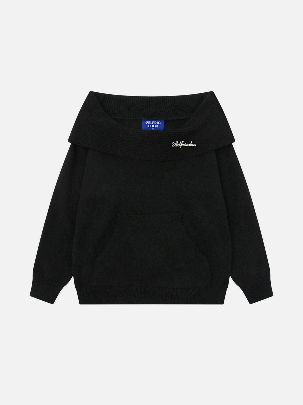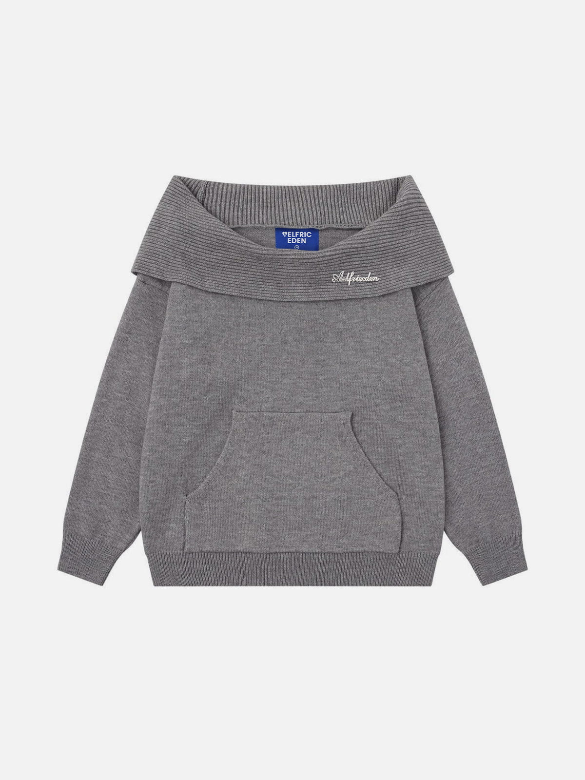 This off-the-shoulder hooded sweater features a wide ribbed neckline that creates a relaxed, draped look. Crafted from soft knit fabric, it provides a comfortable wearing experience while maintaining a clean structure. The design is finished with a front kangaroo pocket and ribbed cuffs and hem for practical everyday use.