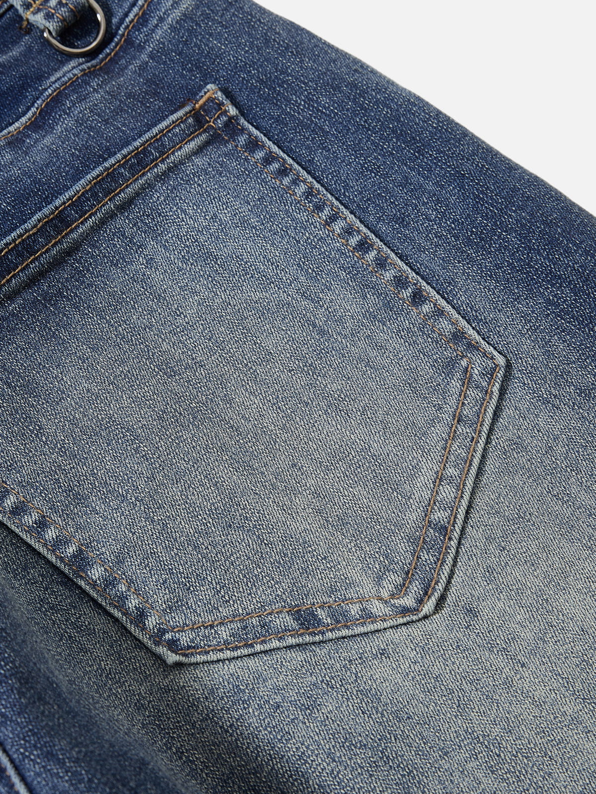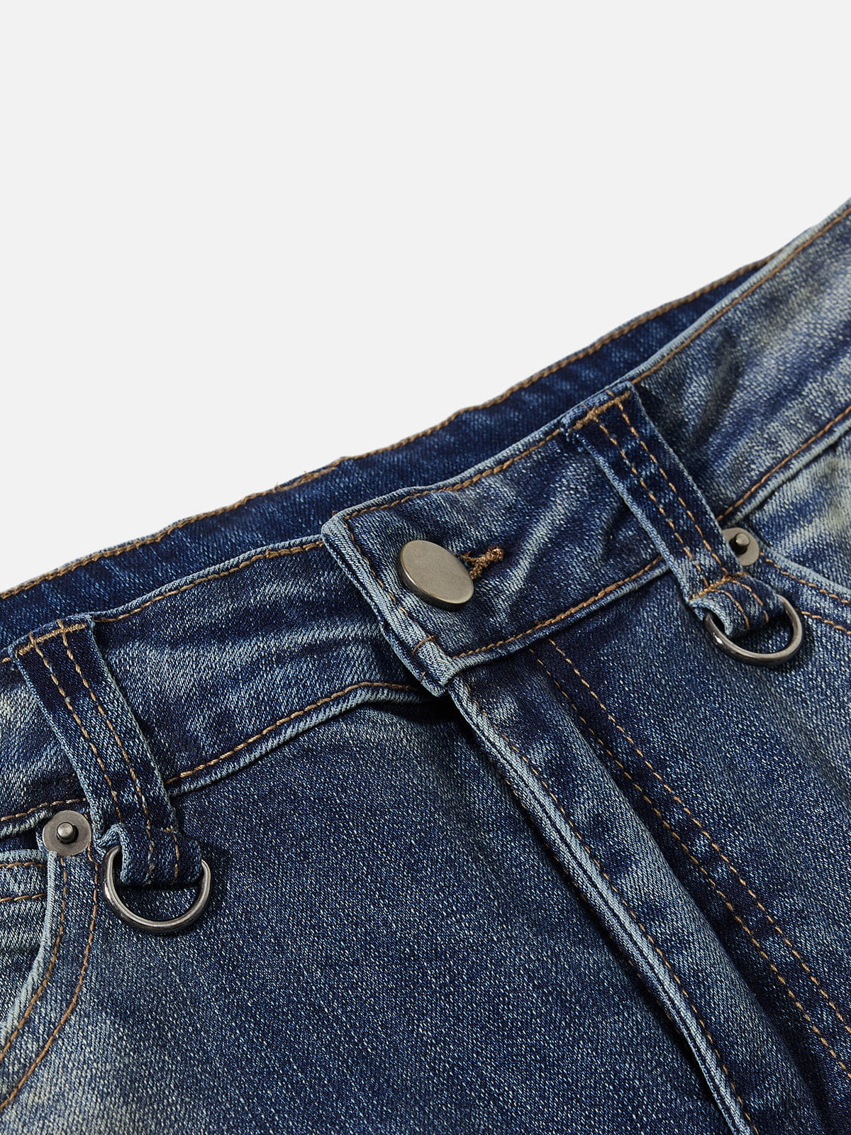 Cut in a bootcut silhouette, these jeans feature heavy washed fading with whisker detailing and paint splatter accents that build layered depth across the leg. Subtle abrasion and shadowed thigh treatments create a worn-in contrast, while the gradual flare from knee to hem elongates the lower line. Structured denim keeps the shape defined, making it easy to balance with fitted tops or cropped outerwear for a sharper proportion.