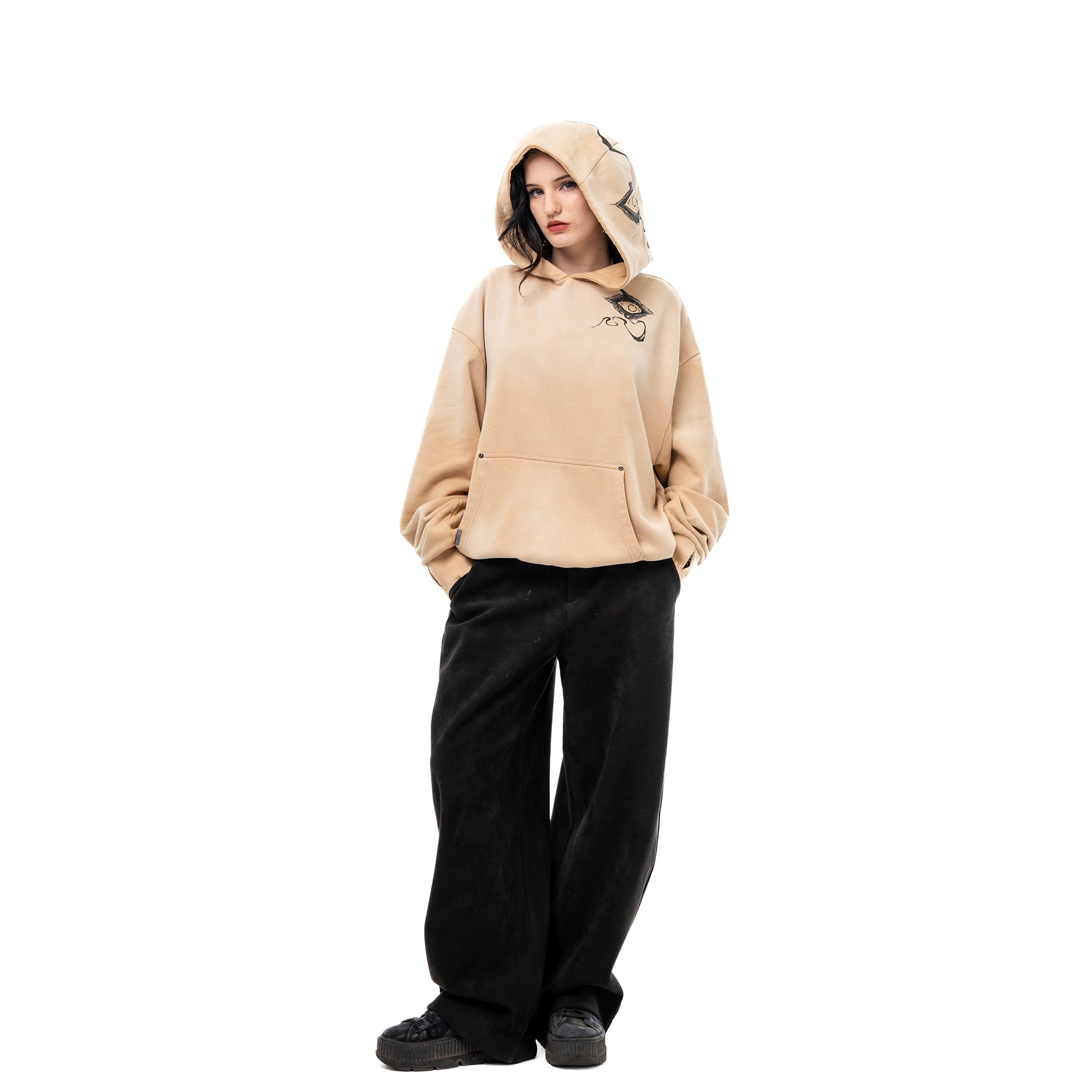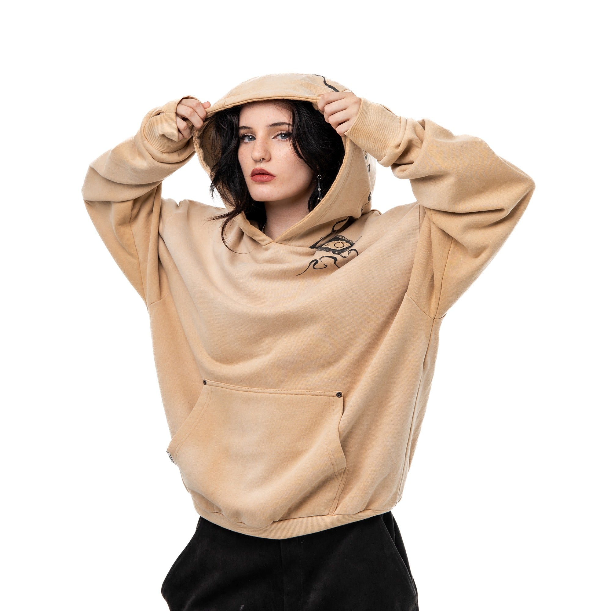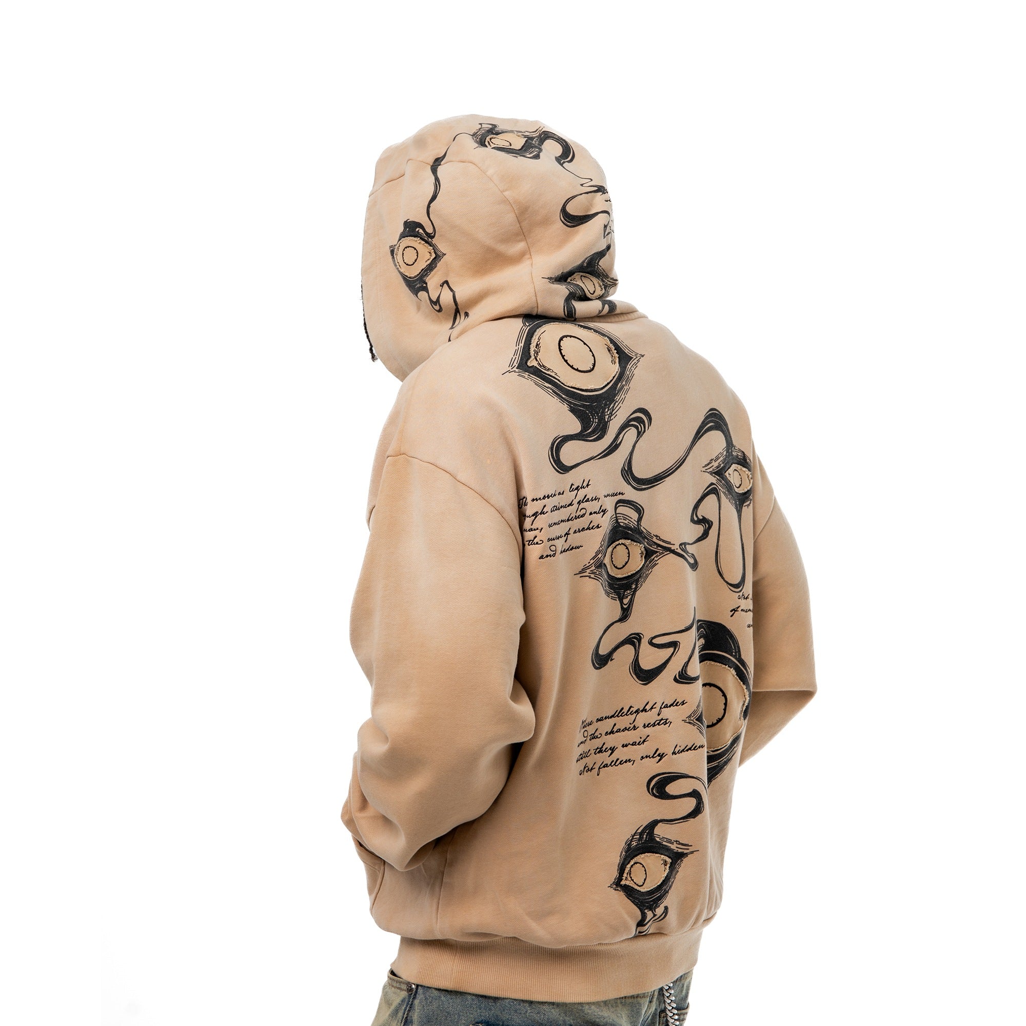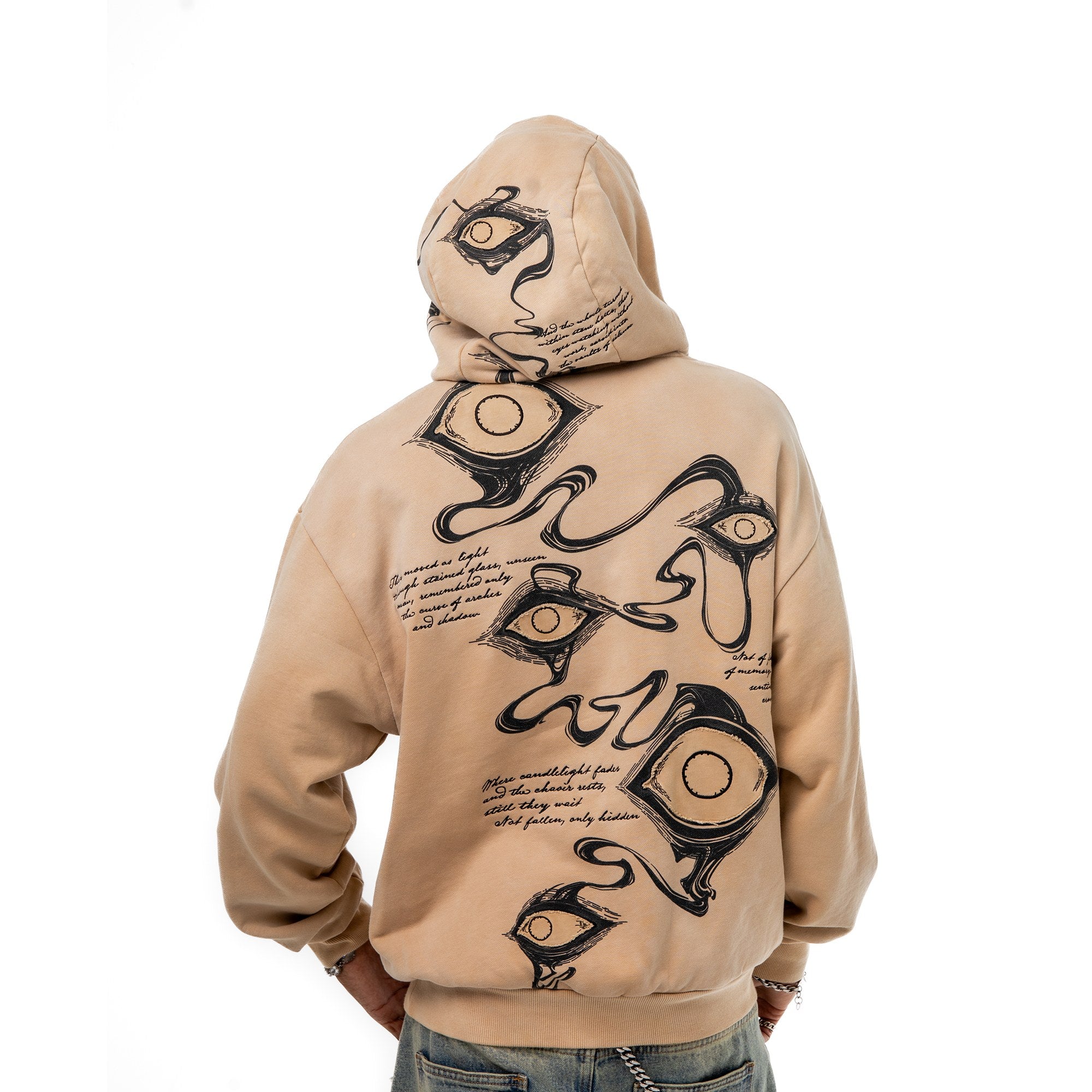 Divine Visions Hoodie - channeling celestial watchfulness through layered multimedia artistry. This oversized hoodie features an all-seeing eye motif that spans the chest, back, and hood panels—rendered through a combination of DTG prints, intricate embroidery, and reverse appliqué cutouts that reveal the base fabric beneath. Treated with a vintage oil wash for a lived-in feel, the piece includes functional thumbholes and silver metal grommets throughout. Scripture embroidery frames the eyes, adding a sacred dimension to the design.