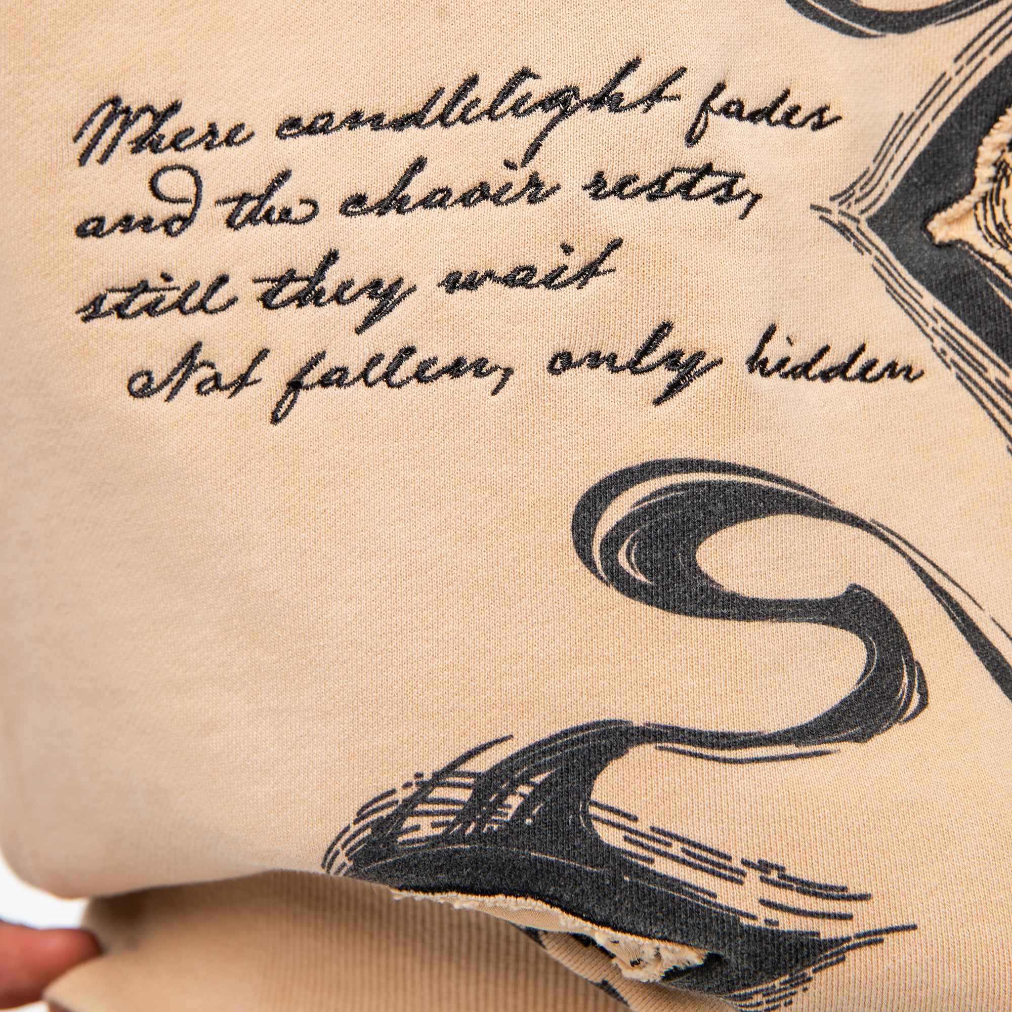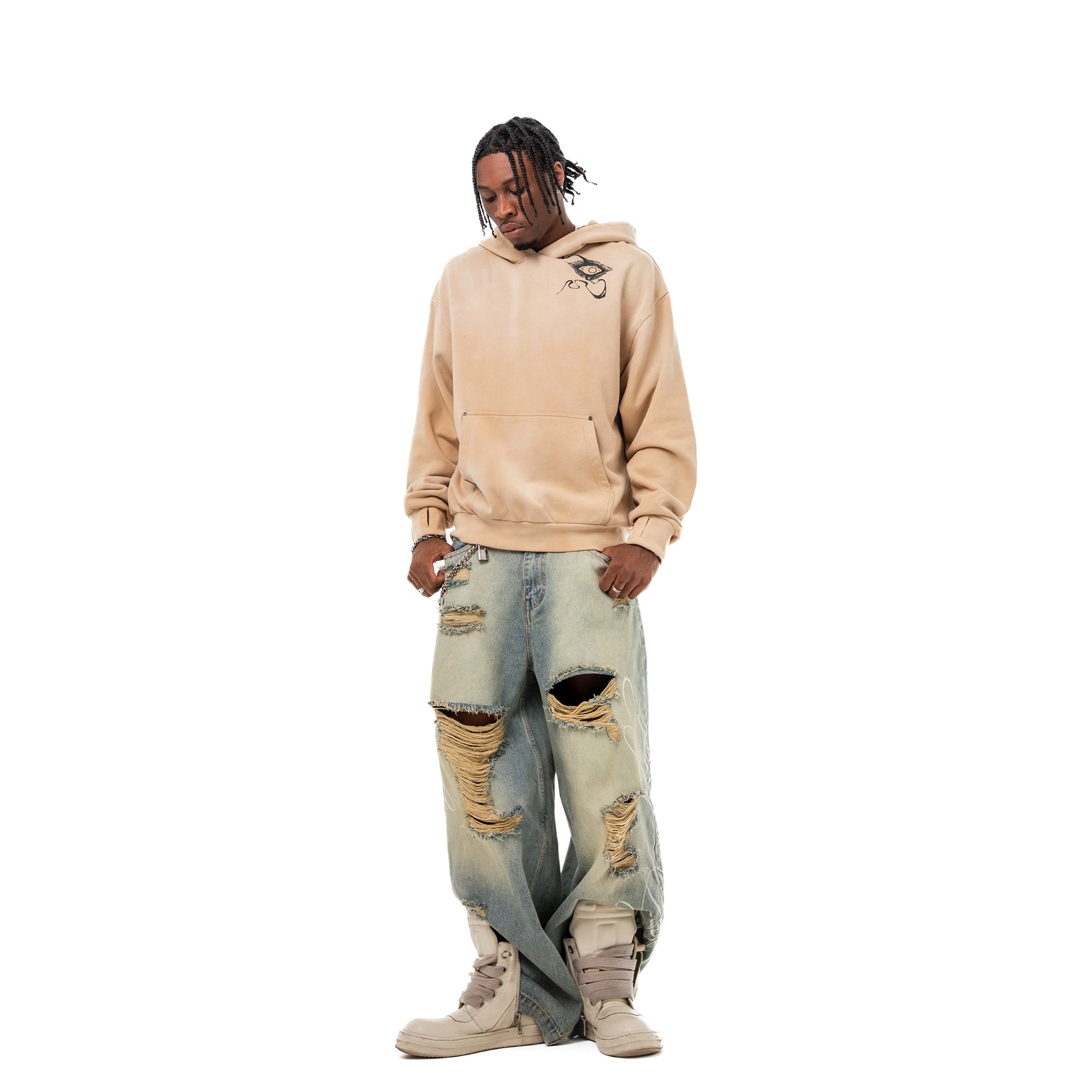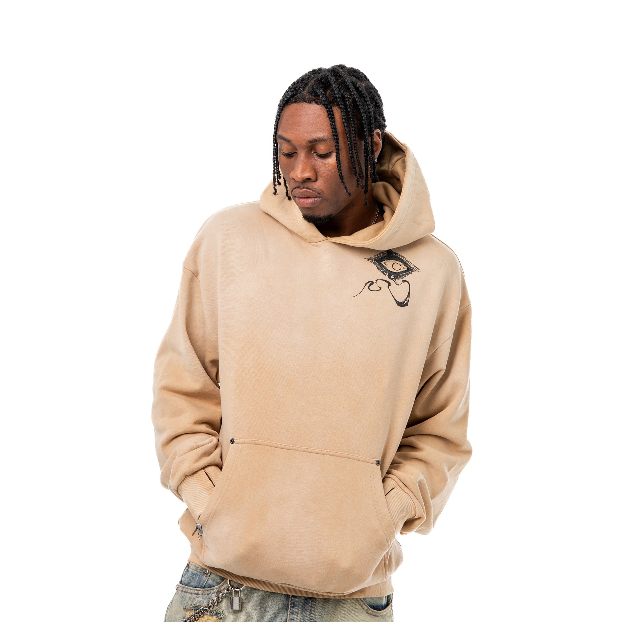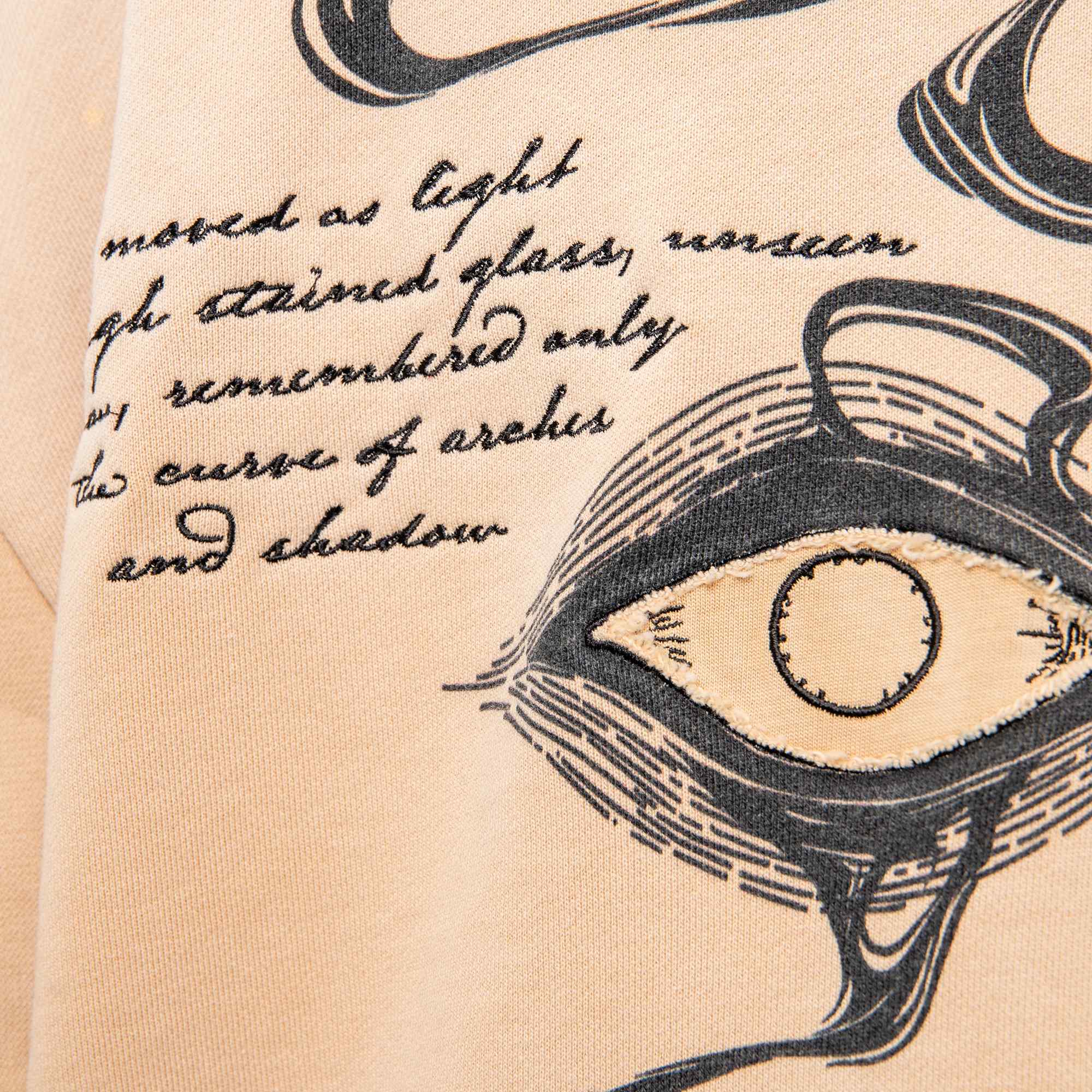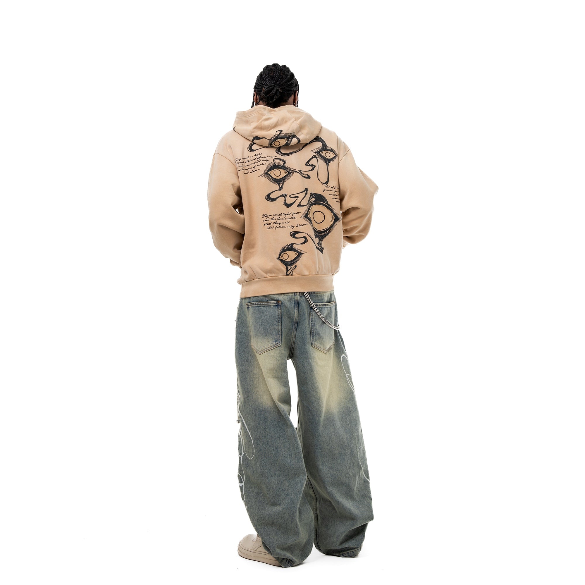 Divine Visions Hoodie - channeling celestial watchfulness through layered multimedia artistry. This oversized hoodie features an all-seeing eye motif that spans the chest, back, and hood panels—rendered through a combination of DTG prints, intricate embroidery, and reverse appliqué cutouts that reveal the base fabric beneath. Treated with a vintage oil wash for a lived-in feel, the piece includes functional thumbholes and silver metal grommets throughout. Scripture embroidery frames the eyes, adding a sacred dimension to the design.