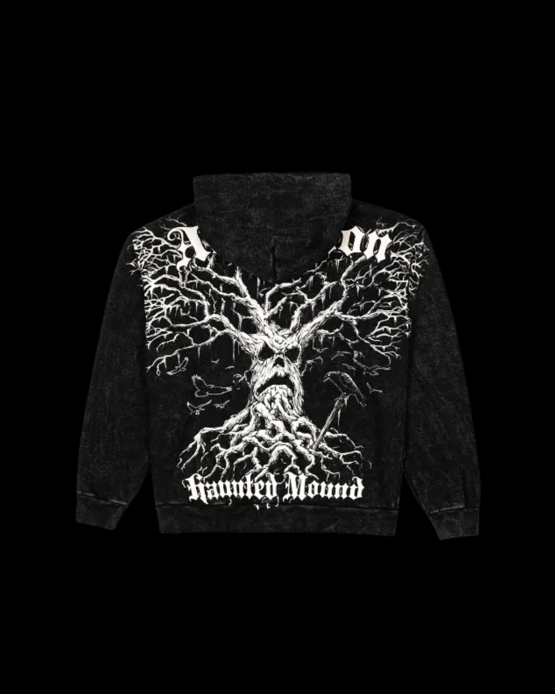 Black zip-up hoodie featuring a haunting distressed tree graphic that stretches across the front and back, forming a twisted, face-like silhouette with branching roots and limbs. The dark washed texture and stark white artwork create a moody gothic atmosphere, while the relaxed fit, full zip closure, and adjustable hood make it easy to layer. Blend, true to size, and ready to ship.