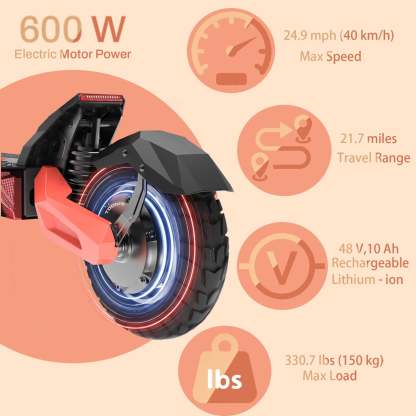 600W Motor & 48V 10Ah Battery – Smooth power delivery with up to 22 miles of range per charge (UL2272 certified).