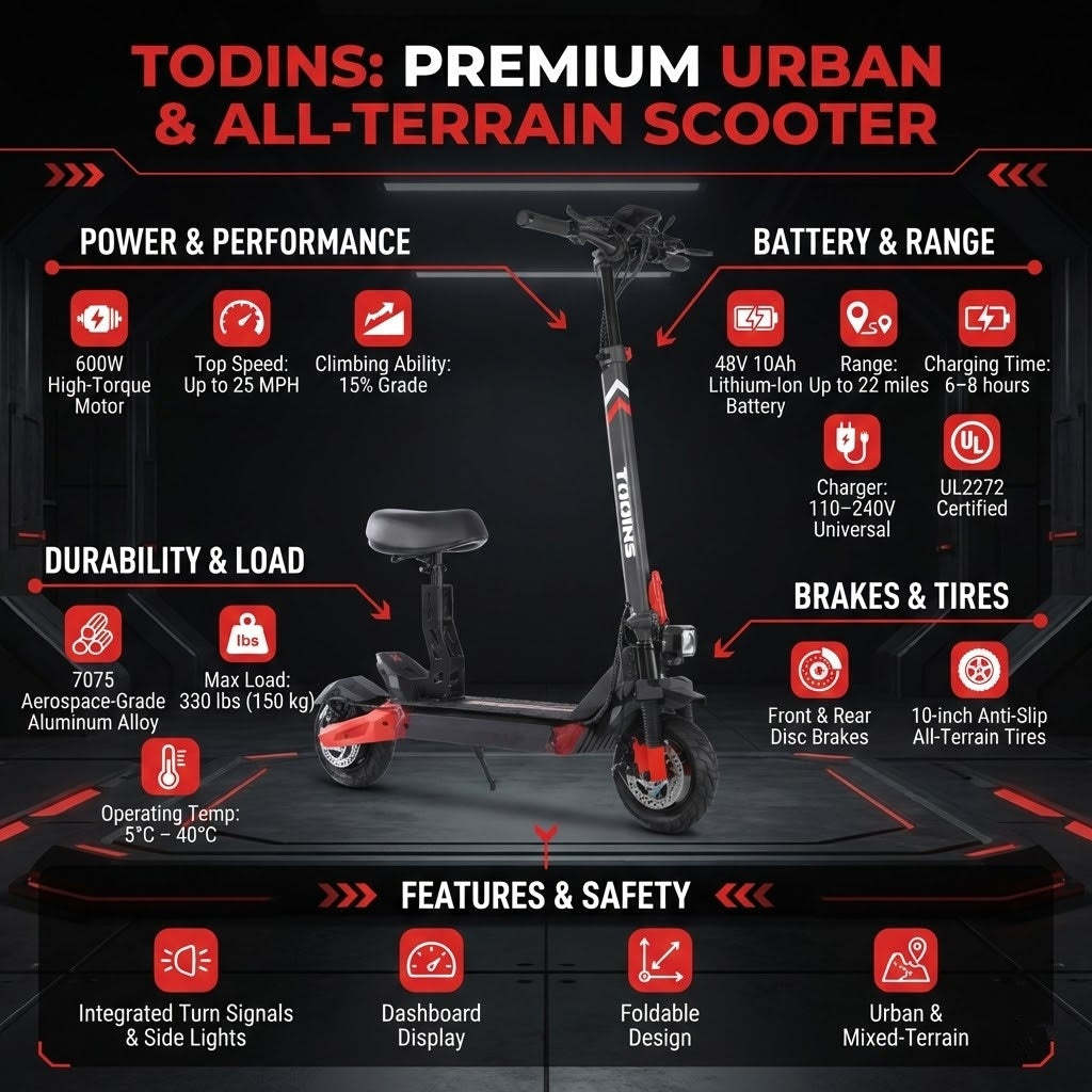 Stable & Safe Ride – 25 MPH top speed, 15% hill climbing, disc brakes, and 10-inch all-terrain tires.